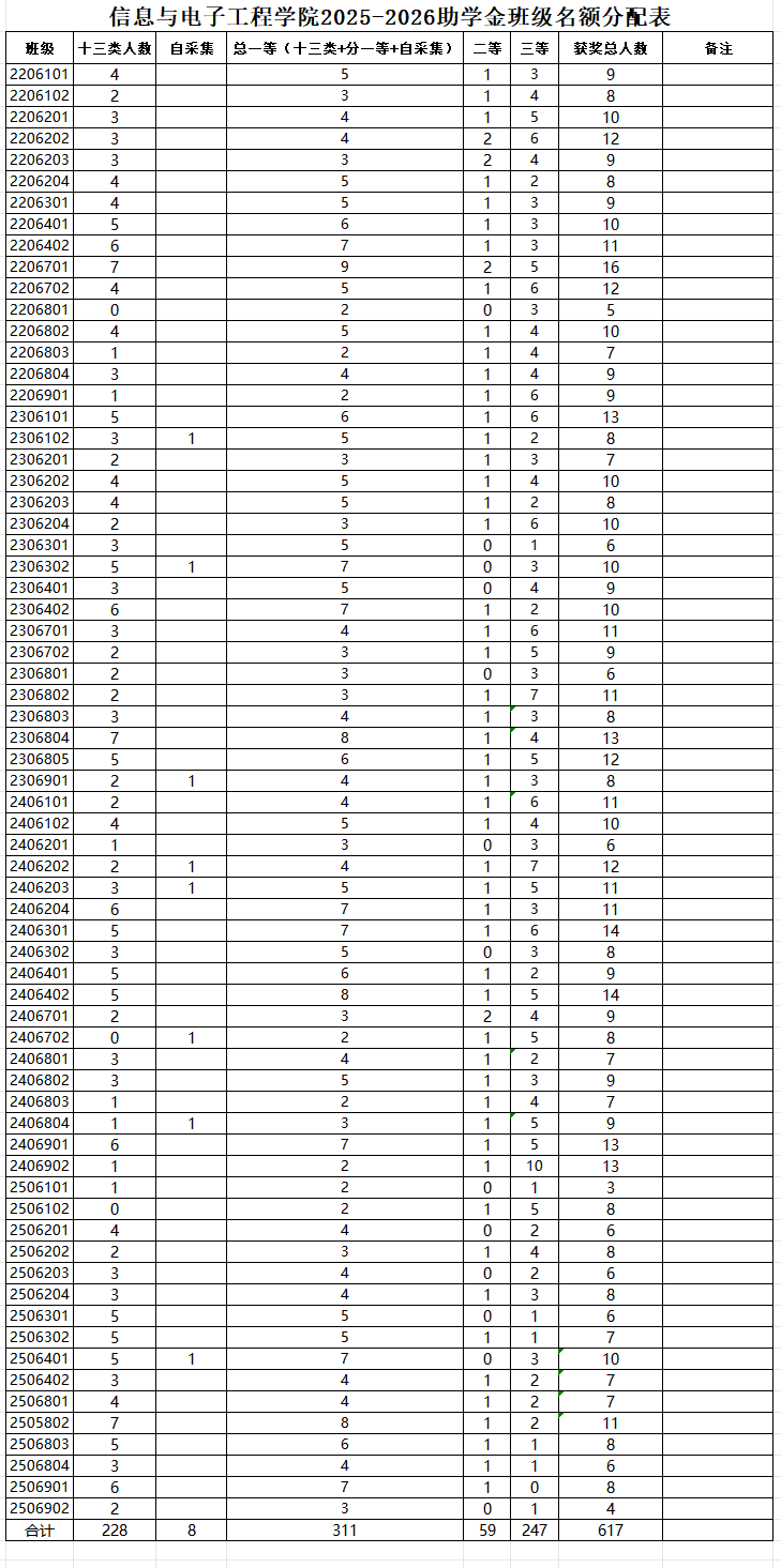 信息与电子工程学院2025-2026学年国家助学金班级名额分配表